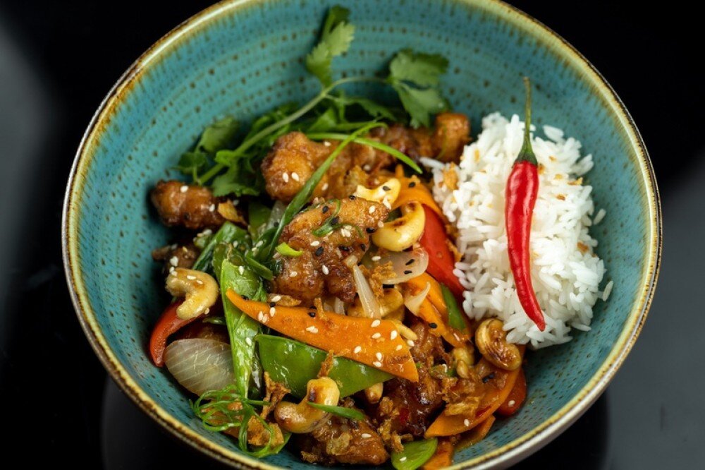 Традиционное блюдо Сычуаньской кухни (Западный Китай) из обжаренного в кляре филе цыплёнка со свежими овощами и арахисом, "Доведённых" на WOK-е. подаётся с рисом. Очень острое и пряное.