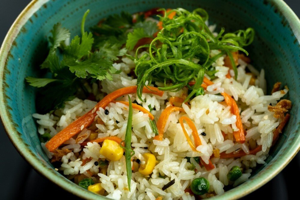 Рис "Жасмин", яйцо, горошек, сладкая кукуруза, морковь