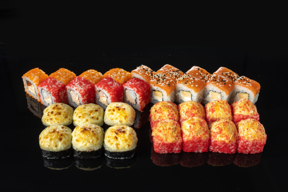 -Тобико ролл (лосось, креветка тигровая, спайси соус, икра 2 цветов), -Филадельфия лайт (лосось, сливочный сыр, омлет),