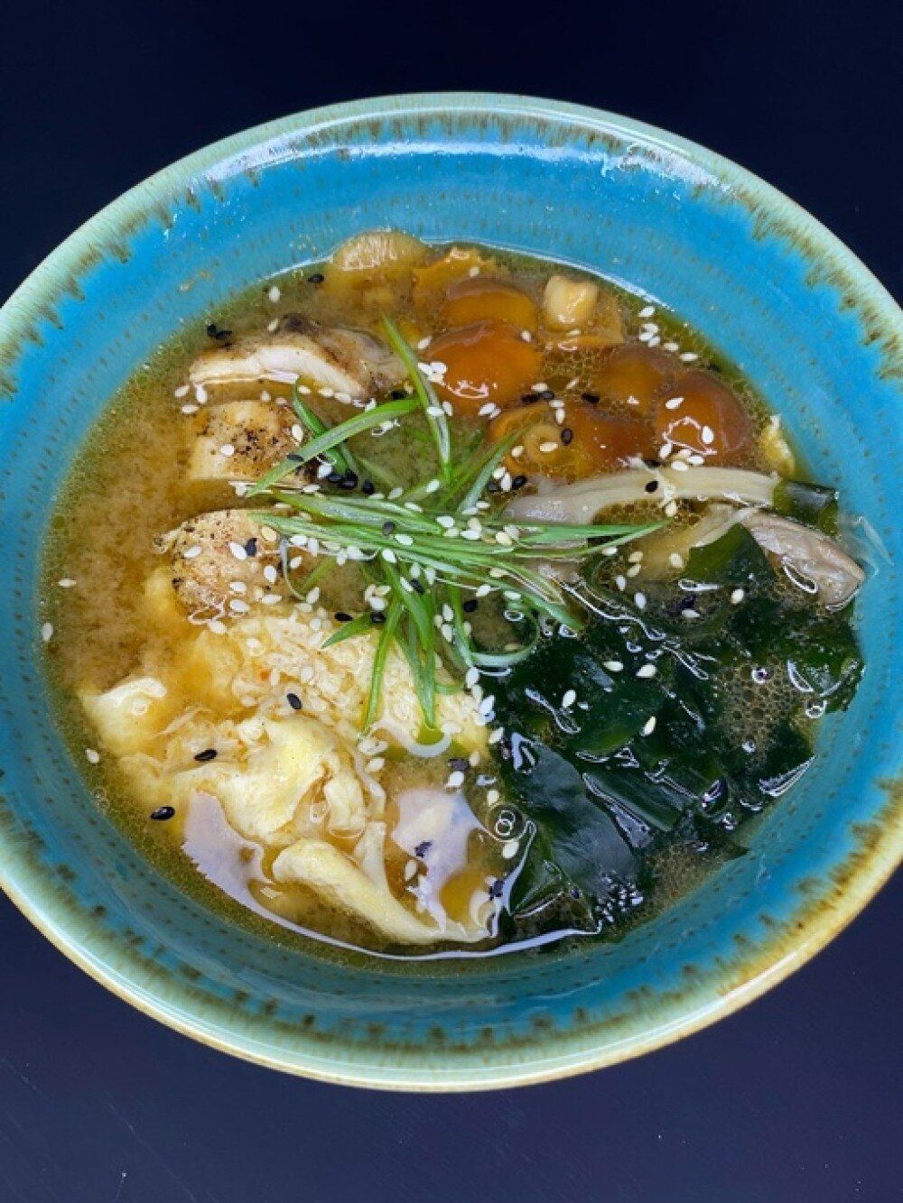 Грибы вешенка,водоросли,лук зелёный,Черри,тофу,Кура,яйцо,острый соус