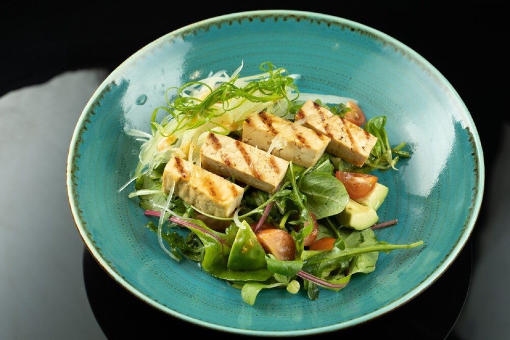 Обжаренный тофу на подушке из микс салата, авокадо и черри. заправляется авторским соусом и кунжутным маслом