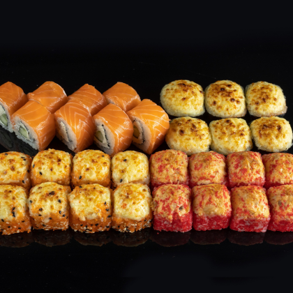 -Сырный угорь (лосось, копченый угорь, сырный соус, сливочный сыр, омлет)