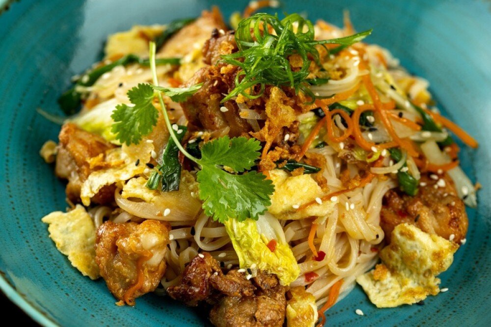 Нежная яичная лапша с маринованной куриной грудкой, сочными овощами и особым соусом натурального состава