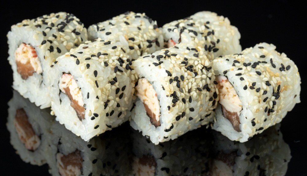 Состав: рис, нори, соус спайси, лосось, краб-крем