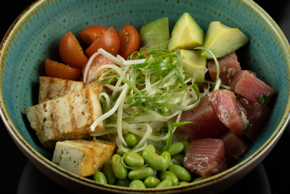 Филе тунца, томаты черри, спелый авокадо, обжаренный Тофу, бобы Эдамаме с соусом от Шефа на рисе.