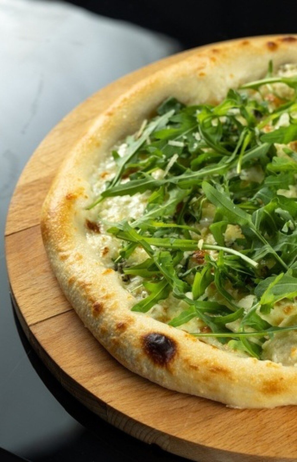 Заказывается только со второй половинкой (на выбор)! Моцарелла, Пармезан, Горгонзола, Фета, сливки, орегано, оливковое масло на фирменном томатном соусе с Рукколой.