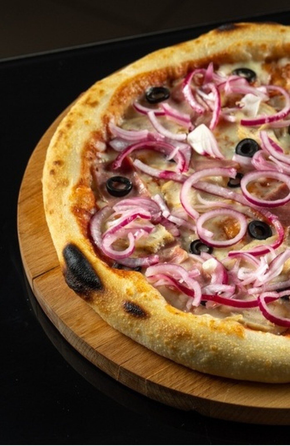 Заказывается только со второй половинкой (на выбор)! Обжаренное филе курицы, соус Барбекю, бекон, красный маринованный лук, маслины, сыр Моцарелла, фирменный томатный соус.