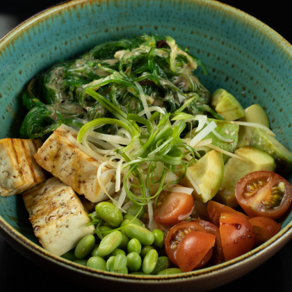 Тигровая креветка, томаты черри, спелый авокадо, обжаренный Тофу, бобы Эдамаме с соусом от Шефа на рисе.