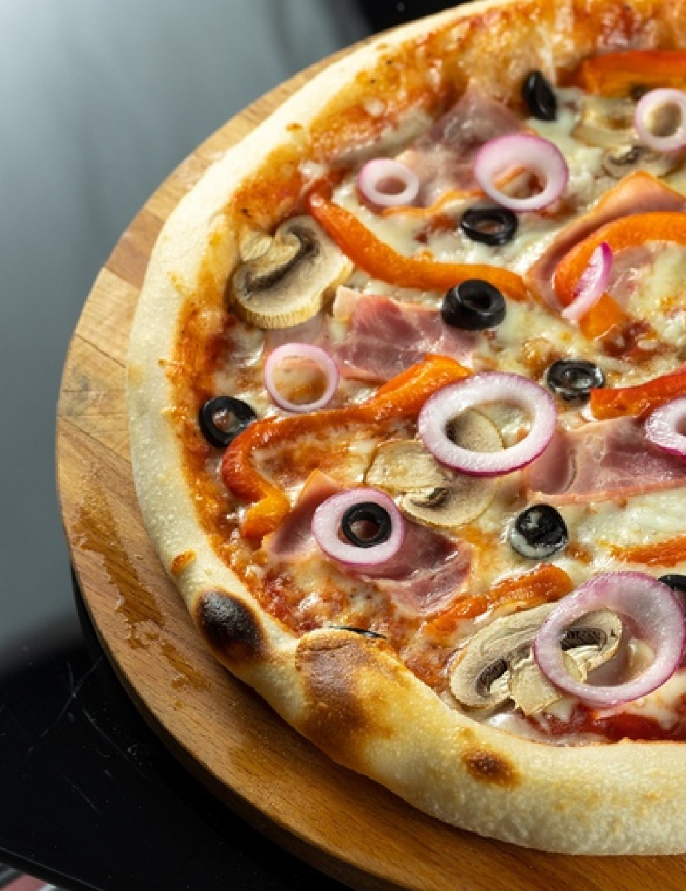 Заказывается только со второй половинкой (на выбор)! Сыр моцарелла, печёная паприка, маслины, бекон, шампиньоны, красный маринованный лук, сыр Пармезан, фирменный томатный соус