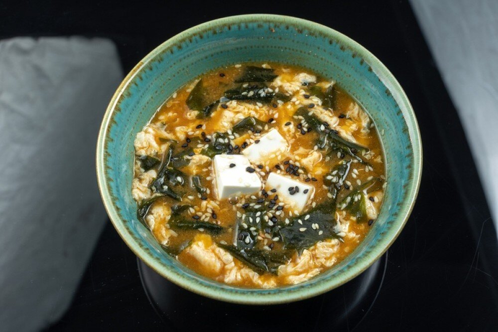 Острый суп с яйцом и водорослями. Для любителей остренького и крепких бульонов.