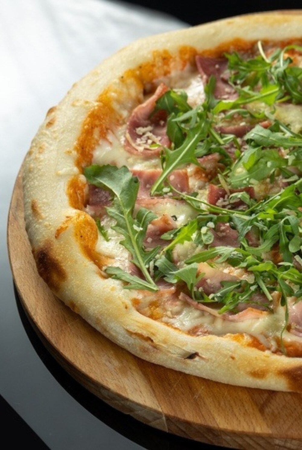 Заказывается только со второй половинкой (на выбор)! Сыр Моцарелла, бекон, сливки, сыр Пармезан, салат Руккола, фирменный томатный соус