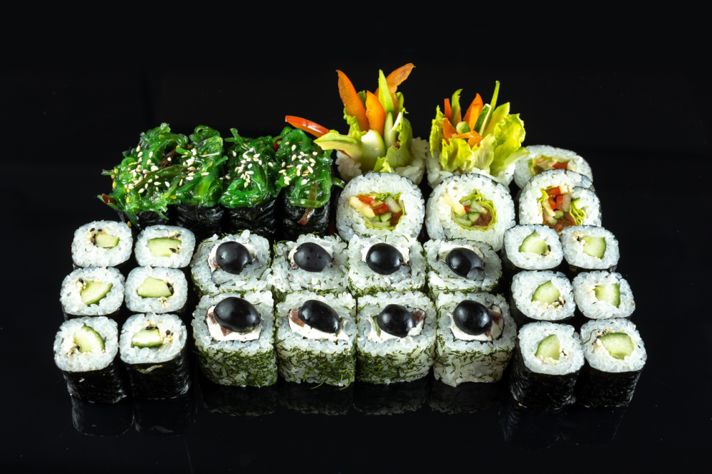 -4 суши с водорослями Чукка -2 ролла с огурцом -Греческий ролл (сливочный сыр, укроп, маслины, огурец, помидор) -Овощной ролл (салат, паприка, огурец, помидор)