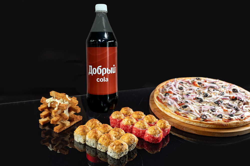 -пицца «Shido» (сыр моцарелла, печёная паприка, маслины, бекон, шампиньоны, красный маринованный лук, сыр Пармезан, фирменный томатный соус),