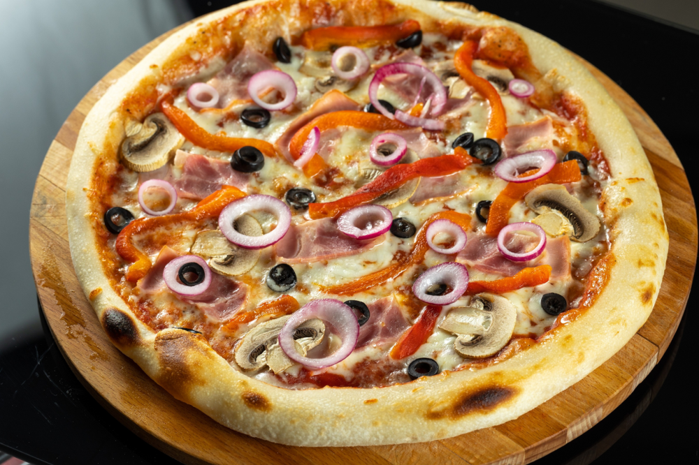 Сыр моцарелла, печёная паприка, маслины, бекон, шампиньоны, красный маринованный лук, сыр Пармезан, фирменный томатный соус