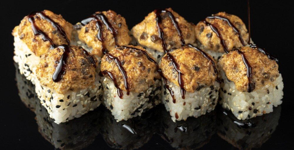 Куриное филе с шампиньонами в спайси соусе, японский омлет, сливочный сыр, унаги соус, кунжут