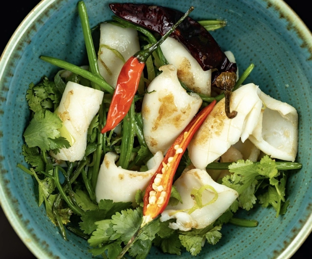 Кальмар обжаренный, дополняется шпинатом, кинзой и луком порей