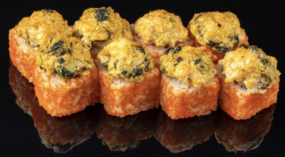 Лосось охлажденный и мидии салатные в спайси соусе, креветки салатные, сливочный сыр, огурец, икра