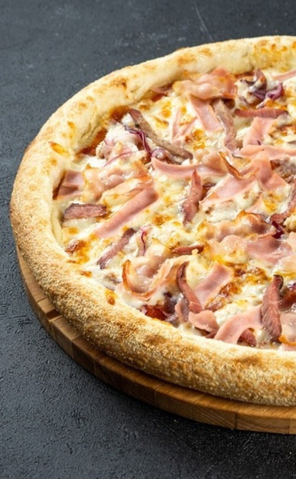 Для тех, кому ну ооооччееннь нравится много мяса в пицце) состоит из курицы, говядины, ветчины, бекона, сыра Моцареллы, маринованного лука, на томатном соусе.