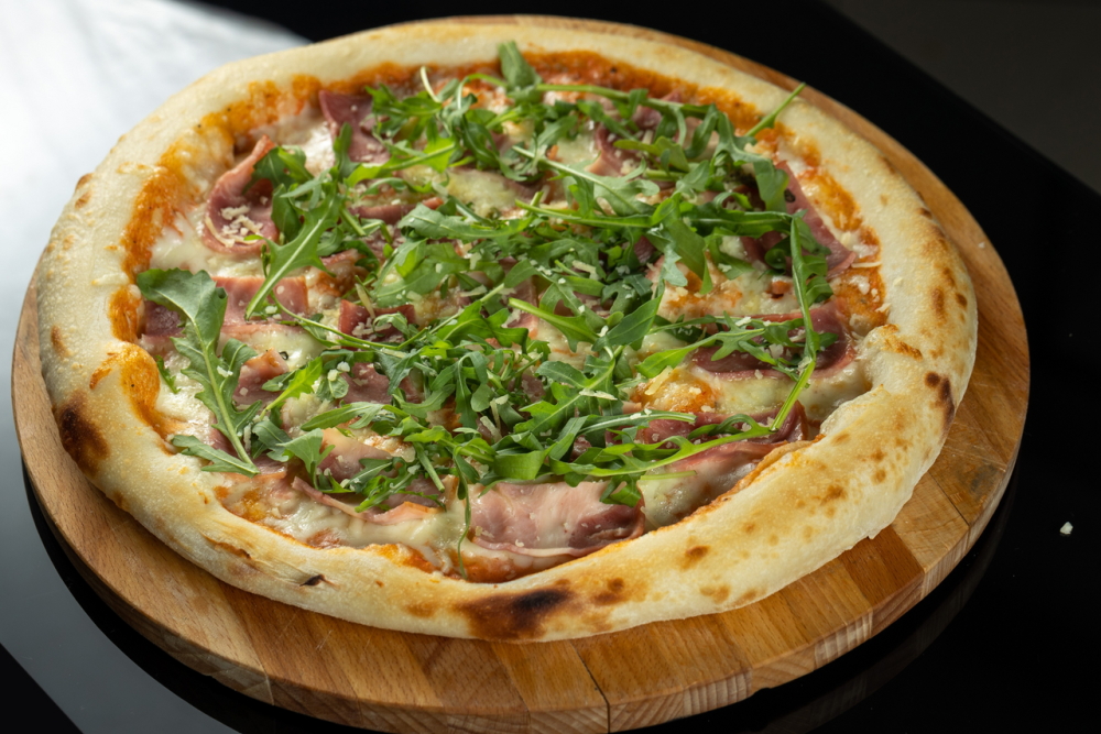 Сыр Моцарелла, бекон, сливки, сыр Пармезан, салат Руккола, фирменный томатный соус