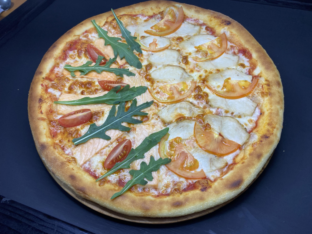 Лосось,курица,моцарелла,томатный соус,Черри , руккола, соус барбекю