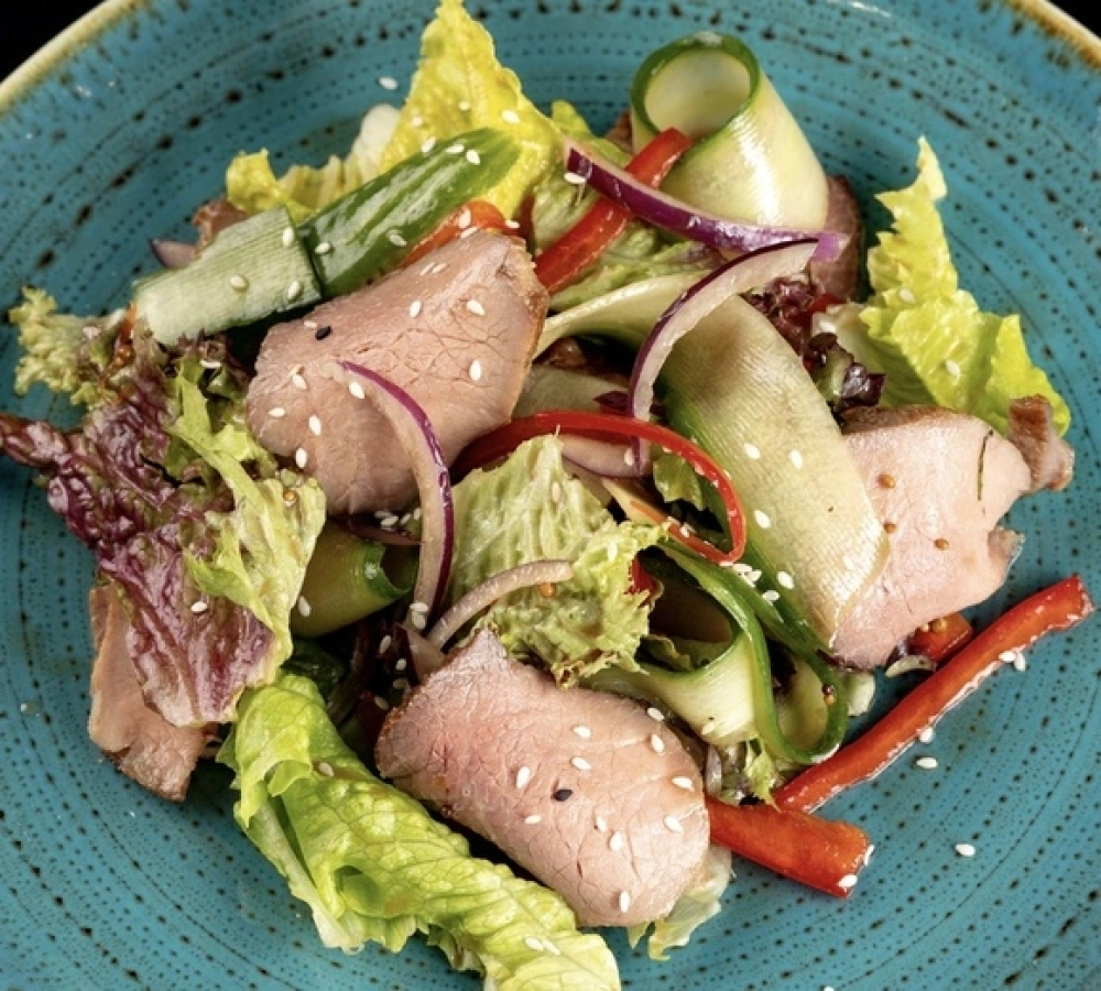 Болгарский перец, микс салата, красный лук, огурец и сельдерей. Сверху нежный ростбиф. Соус авторский.