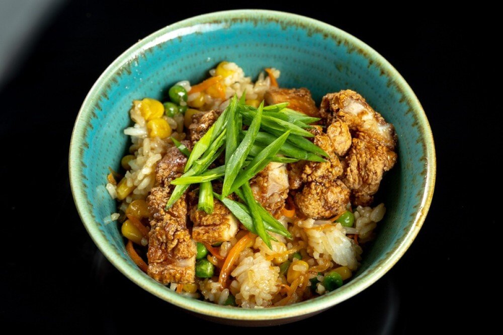 Рис "Жасмин", куриное филе, яйцо, горошек, сладкая кукуруза, морковь