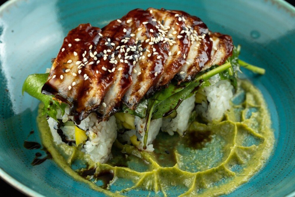 На верхушке- Сашими из филе копчёного угря , под нашим фирменным соусом