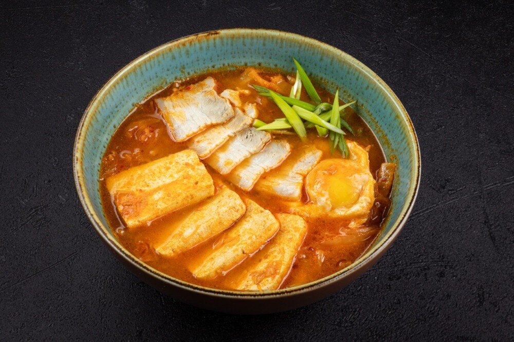 Традиционный корейский суп с древней историей, необычайной густотой и специфическим ароматом ферментированного кимчи, что придаёт супу характерную кислоту и остроту. Подаётся с рисом и острым соусом Чиби.