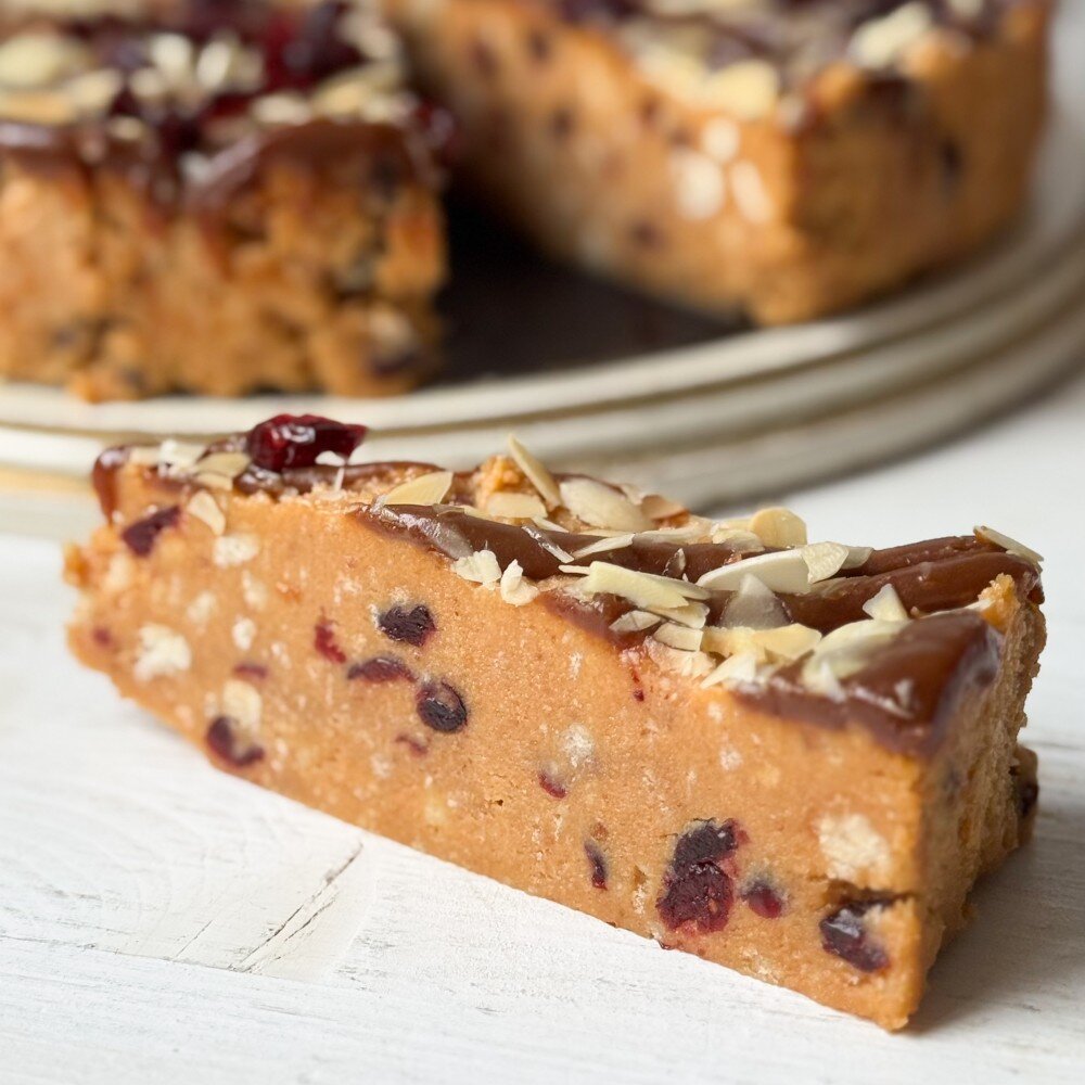 Сочный песочно-карамельный торт с сушеной клюквой и кусочками печенья. Сверху торт украшен волнами мягкой карамели, лепестками миндаля и клюквой.